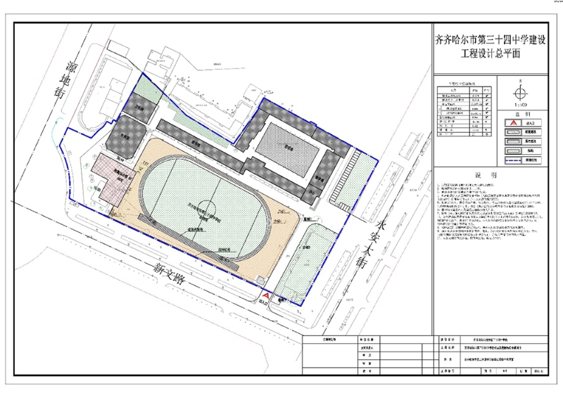 齊齊哈爾市政府網(wǎng)站2023年3月公布的《齊齊哈爾市第三十四中學(xué)校校園新建附屬綜合樓項目建設(shè)工程設(shè)計總平面修改批前公示》,圖例顯示黑色粗線為用地紅線。