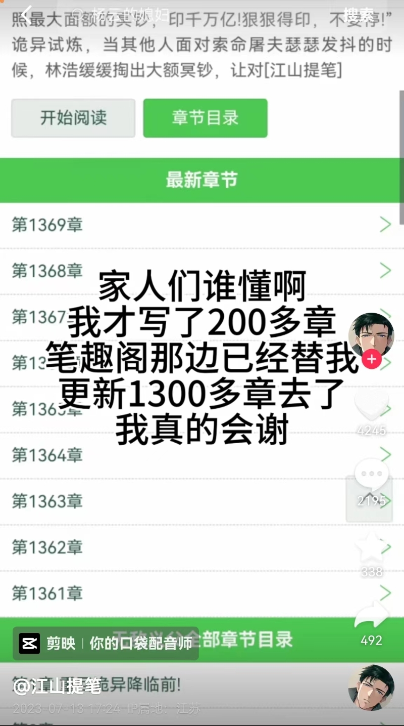 近日,網(wǎng)絡(luò)作家“江山提筆”公開表示自己的連載小說《詭異末日:開局狂印千萬億冥鈔》更新到245章,卻發(fā)現(xiàn)被盜版網(wǎng)站搬運(yùn)內(nèi)容后已經(jīng)將小說更新到了1000多章,并吐槽“盜版網(wǎng)站可能掙得比自己還多”。