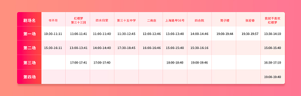 從國際戲劇公園小程序展示的7月23日節(jié)目單可以看出,“只有紅樓夢·戲劇幻城”的劇場安排分為主劇場和微劇場。主劇場中,真亦假、有還無、讀者劇場每天都安排了兩場演出,每場演出時(shí)間均超過或接近1個(gè)小時(shí)。微劇場中,有的節(jié)目一天甚至排了四場。