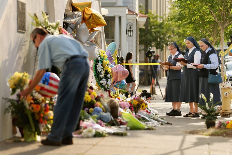 當地時間2015年6月19日,美國南卡羅來納州查爾斯頓市,槍擊案發(fā)生的教堂外,民眾為遇難者哀悼。