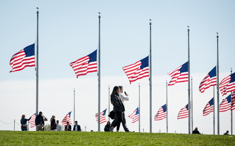 當地時間2023年3月30日,美國華盛頓特區(qū),田納西州納什維爾發(fā)生大規(guī)模校園槍擊事件,市民經過降半旗的紀念碑。