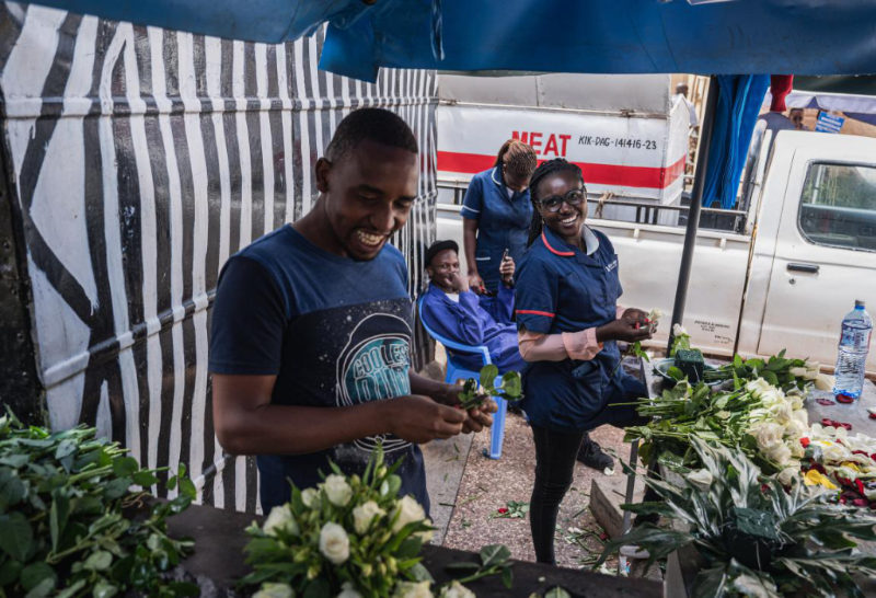 7月10日,在肯尼亞首都內(nèi)羅畢的一個市場,商販在修剪待售的鮮花。新華社記者 王冠森 攝