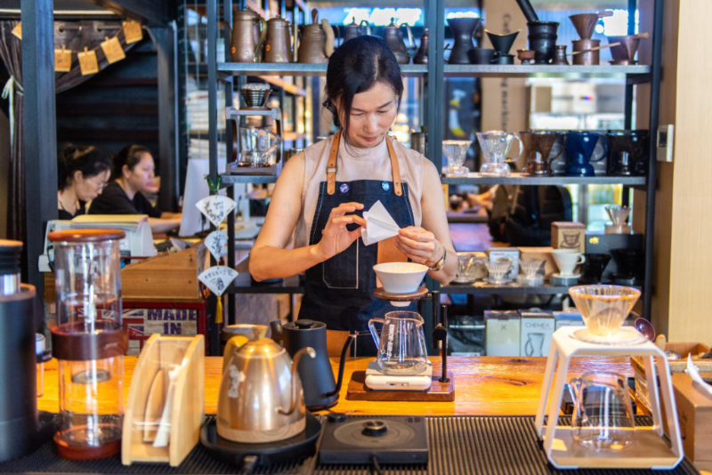 7月1日,在湖南高橋大市場的“咖啡一條街”,玖秀咖啡負責人肖雍琪在沖泡咖啡。新華社記者 陳思汗 攝