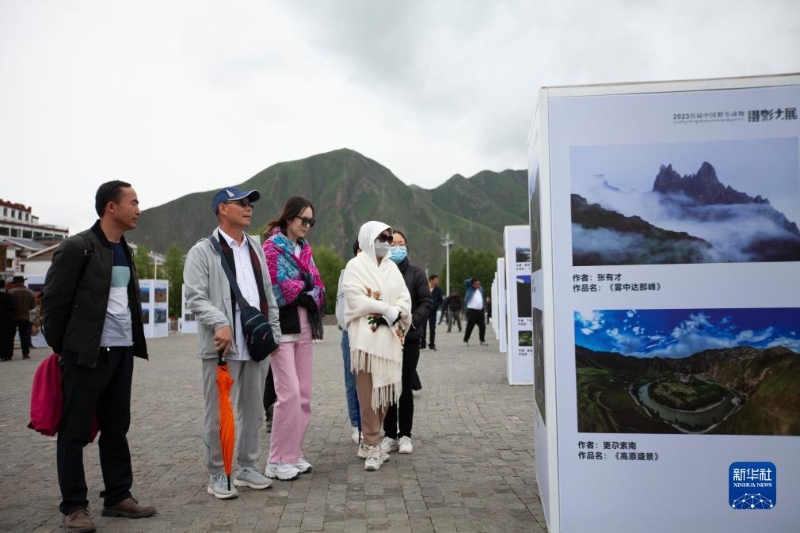 7月23日,人們?cè)谇嗪S駱?shù)格薩爾廣場(chǎng)參觀2023首屆中國(guó)野生動(dòng)物攝影大展預(yù)展。