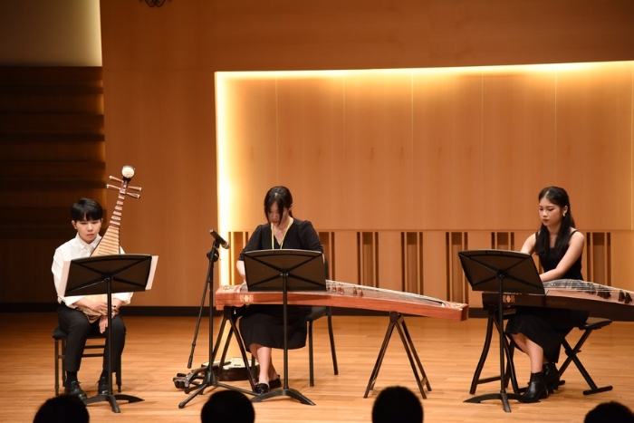 7月18日,在中國(guó)文化大學(xué)音樂廳,臺(tái)灣青年樂手陳德夫(左一)、陳佳伶(右一)與北京大學(xué)學(xué)生陳凱迪聯(lián)袂獻(xiàn)上民樂表演。新華社記者 王承昊 攝