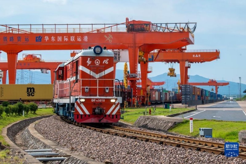 7月25日,在浙江省金華市華東國際聯(lián)運港,一輛“義新歐”中歐班列在海關(guān)監(jiān)管下,裝載著110個標(biāo)箱日用百貨、家用電器、家裝材料等貨物,啟程駛向哈薩克斯坦。