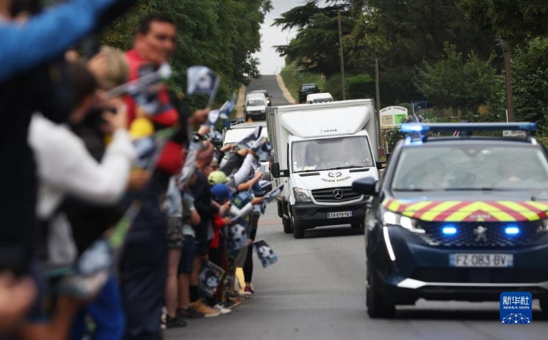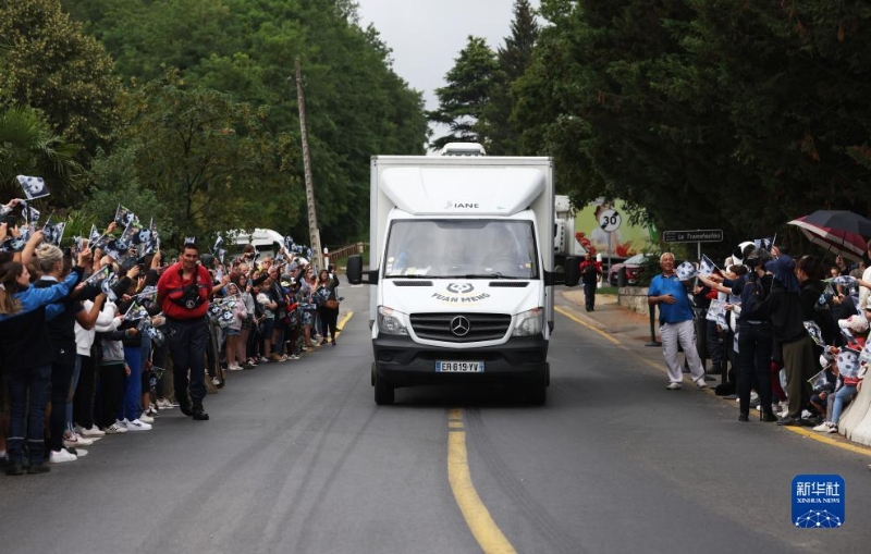 7月25日,在法國(guó)圣艾尼昂市博瓦勒野生動(dòng)物園外,人們送別搭載熊貓“圓夢(mèng)”的車(chē)離開(kāi)。
