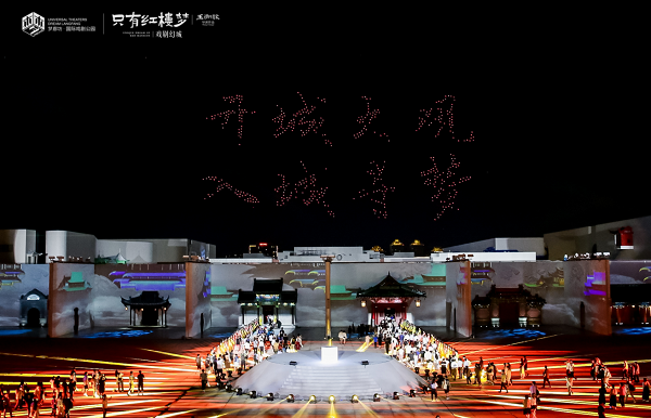 隨著音樂(lè)響起,激光束自舞臺(tái)射向天空,猶如巨型光筆在天空中書(shū)寫(xiě)。光筆在空中觸發(fā)了無(wú)人機(jī)群動(dòng)作,展開(kāi)無(wú)人機(jī)表演。一本巨大的《紅樓夢(mèng)》書(shū)籍打開(kāi),文字像星火從空中墜入幻城,緊接著,由無(wú)人機(jī)組成的讀者符號(hào)——紅色官帽椅,從幻城中冉冉升起。椅子化做只有紅樓夢(mèng)·戲劇幻城logo,并點(diǎn)燃機(jī)身攜帶的冷煙花,在空中飄舞,最終化成邀請(qǐng)文字“開(kāi)城大觀,入城尋夢(mèng)”。在歡呼聲中,游客們紛紛入城,真正開(kāi)啟了屬于自己的中國(guó)文化探尋之旅。