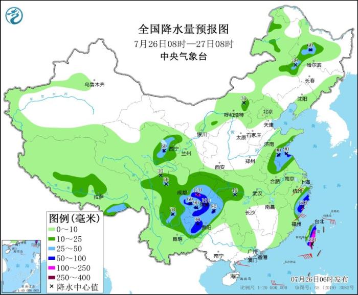 預(yù)計(jì),7月26日08時(shí)至27日08時(shí),青海東部、江蘇北部、山東南部、浙江東部、福建東北部、四川東部和南部、貴州西部和北部、臺(tái)灣島等地部分地區(qū)有大到暴雨,其中,浙江東南部、四川盆地中部、重慶西部、臺(tái)灣島東部等地部分地區(qū)有大暴雨,臺(tái)灣島東部局地特大暴雨(250~350毫米)。上述部分地區(qū)伴有短時(shí)強(qiáng)降水(最大小時(shí)降雨量20~50毫米,局地可超過(guò)80毫米),局地有雷暴大風(fēng)等強(qiáng)對(duì)流天氣。中央氣象臺(tái)7月26日06時(shí)繼續(xù)發(fā)布暴雨藍(lán)色預(yù)警。