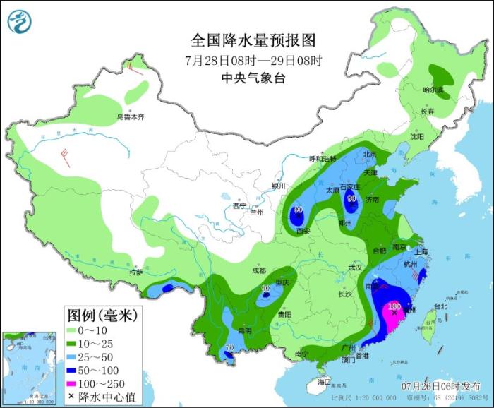7月28日08時(shí)至29日08時(shí),西藏東部、西北地區(qū)東北部、華北大部、黃淮大部、江淮大部、江南大部、西南地區(qū)東部和南部、華南中北部和南部等地部分地區(qū)有中到大雨,其中,陜西中部、河北南部、河南北部、江西中部、福建大部、廣東東南部等地部分地區(qū)有暴雨或大暴雨(100~180毫米)。新疆北疆北部和南疆盆地、江西中部、福建西北部等地部分地區(qū)有4~6級(jí)風(fēng),其中,浙江中部部分地區(qū)有6~7級(jí)風(fēng)。