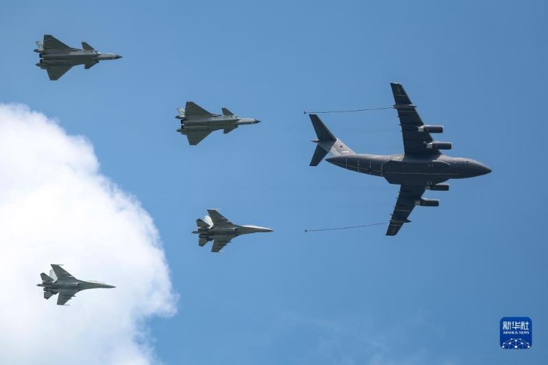 7月26日,在2023年空軍航空開放活動·長春航空展上,運油-20與殲-20、殲-16進行空中加油通場展示。新華社記者 顏麟蘊 攝
