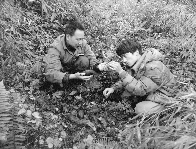 “中國大熊貓之父”胡錦矗(左)與時(shí)任“五一棚”監(jiān)測(cè)站負(fù)責(zé)人王鵬彥(右)一起分析大熊貓糞團(tuán),尋找它們的活動(dòng)蹤跡,以準(zhǔn)確地投放補(bǔ)充飼料。新華社記者 金勖琪 攝
