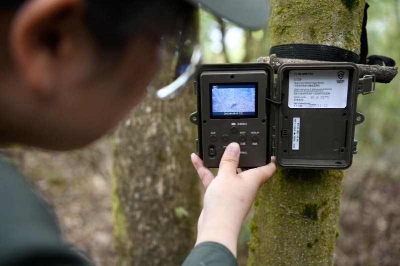 5月15日,在大熊貓國家公園滎經(jīng)片區(qū),滎經(jīng)縣管護(hù)總站科研檢測(cè)負(fù)責(zé)人付明霞在翻看紅外相機(jī)里拍攝到的小熊貓畫面。新華社記者 胥冰潔 攝