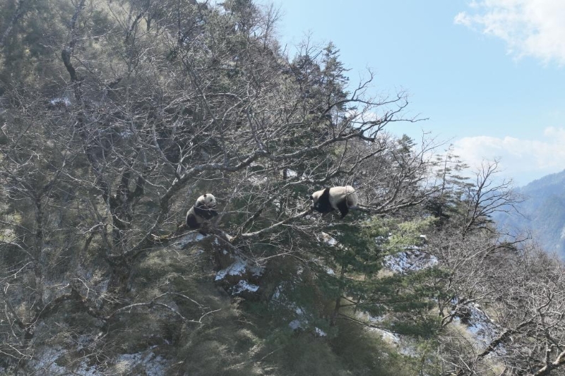 3月3日,大熊貓國家公園唐家河片區(qū)工作人員在摩天嶺將軍寨區(qū)域發(fā)現(xiàn)兩只野生大熊貓(無人機(jī)照片)。(大熊貓國家公園唐家河片區(qū)供圖)