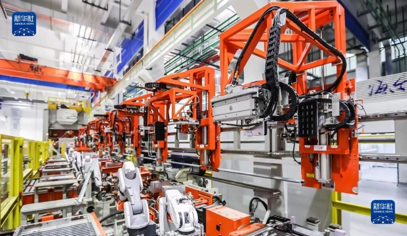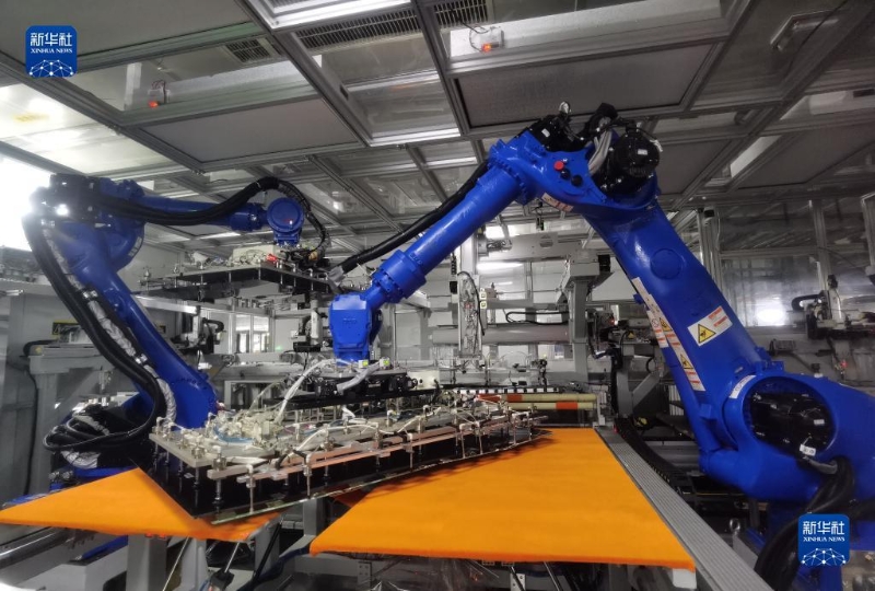 在位于青島的海信視像智能車間的生產(chǎn)線上,機(jī)器人對(duì)液晶面板和背光板自動(dòng)化精準(zhǔn)卡合(6月19日攝)。新華社記者 王凱 攝