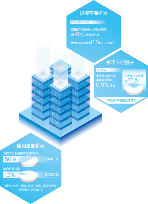 算力作為數(shù)字經濟時代新的生產力,對推動科技進步、賦能行業(yè)數(shù)字化轉型、促進經濟社會發(fā)展發(fā)揮著日益重要的作用。近年來,我國算力產業(yè)不斷發(fā)展、創(chuàng)新能力日益提升,截至2022年底,我國在用數(shù)據(jù)中心機架總規(guī)模超過650萬標準機架,算力總規(guī)模達到180百億億次/秒。