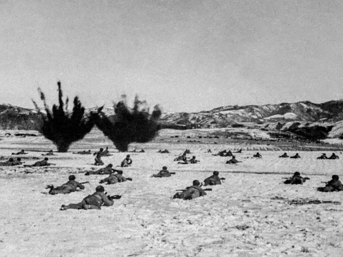 圖為現(xiàn)場展出照片,張崇岫拍攝于1950年11月,中國人民志愿軍某部戰(zhàn)士們在雪地里匍匐向敵軍前沿陣地運(yùn)動(dòng)。(主辦方供圖)
