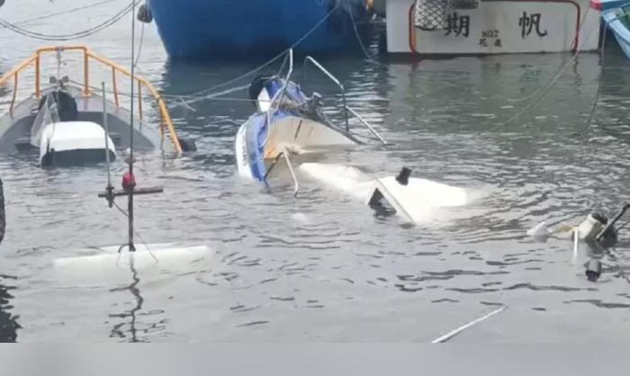 富岡漁港有2艘漁船疑因搖晃劇烈碰撞浸水沉船,漁民損失慘重。圖片來源:臺灣《聯(lián)合報》尤聰光攝。