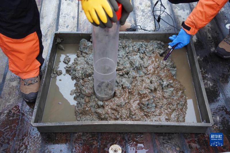 7月26日,中國(guó)第13次北冰洋科學(xué)考察隊(duì)隊(duì)員在采集箱式沉積采樣獲取的海洋底質(zhì)樣品。新華社記者 魏弘毅 攝