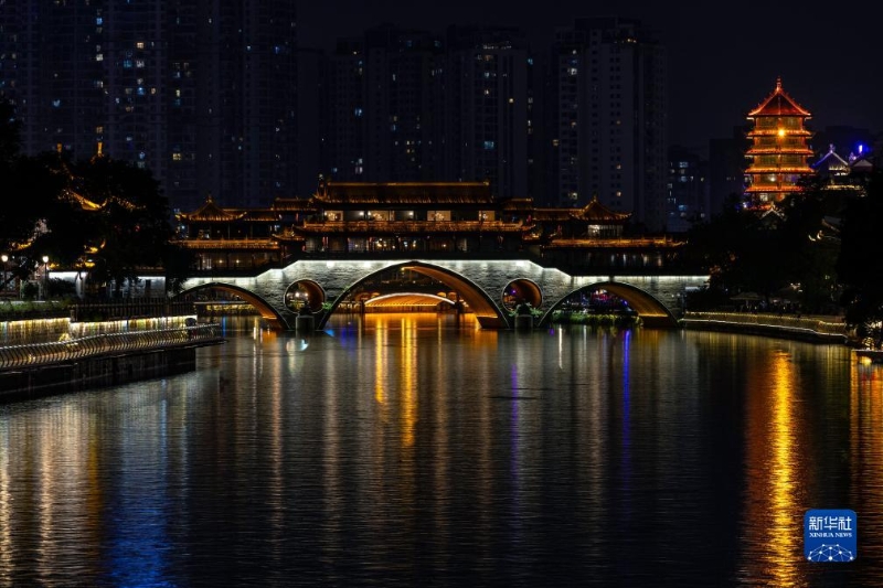 夜色中的都江堰市南橋(5月14日攝)。