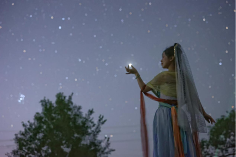 2023年7月17日,在新疆哈密巴里坤古城,一名漢服愛好者和星空“合影”。(周博攝)