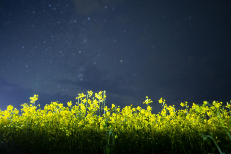 2023年7月18日,在新疆哈密巴里坤松樹塘拍攝的盛開的油菜花和夏日星空。(周博 攝)