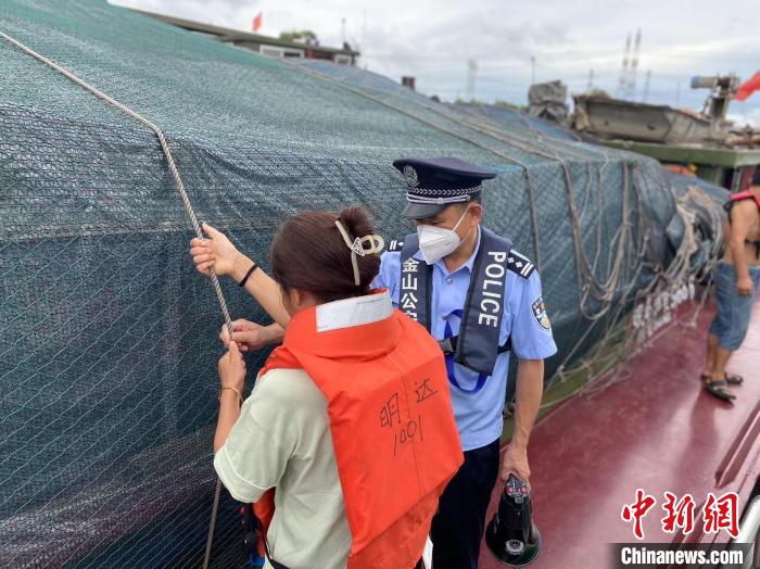 7月27日,上海市公安局金山分局民警正對靠岸的船只進行安全檢查。(上海市公安局金山分局供圖)