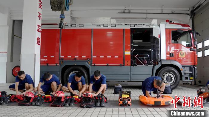 7月28日,消防救援人員對橡皮艇、救生衣、水域救援服、救援機器人等水域救援裝備清點維護。(上海市金山區(qū)消防救援支隊供圖)