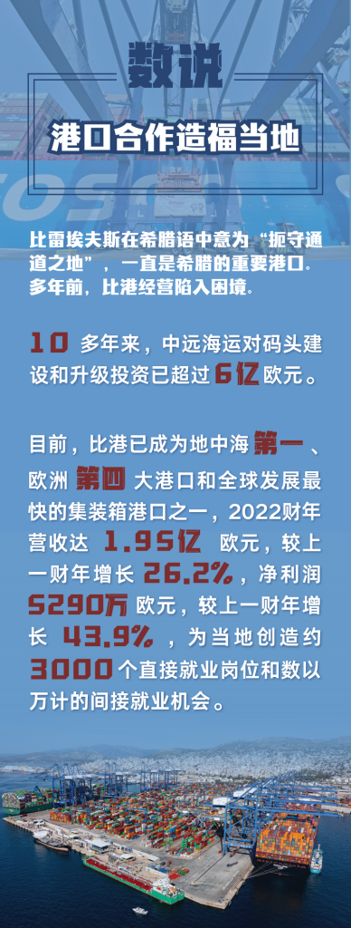 比雷埃夫斯在希臘語中意為“扼守通道之地”,一直是希臘的重要港口。多年前,比港經(jīng)營陷入困境。中國遠(yuǎn)洋海運集團(中遠(yuǎn)海運)2008年與希臘方面簽署特許經(jīng)營權(quán)協(xié)議,2010年接管比港二號、三號集裝箱碼頭,2016年收購比港港務(wù)局67%股權(quán)并接手港務(wù)局經(jīng)營。十多年來,中遠(yuǎn)海運對碼頭建設(shè)和升級投資已超過6億歐元。如今比港已成為地中海第一、歐洲第四大港口和全球發(fā)展最快的集裝箱港口之一,2022財年營收達1.95億歐元,較上一財年增長26.2%,凈利潤5290萬歐元,較上一財年增長43.9%,為當(dāng)?shù)貏?chuàng)造約3000個直接就業(yè)崗位和數(shù)以萬計的間接就業(yè)機會。