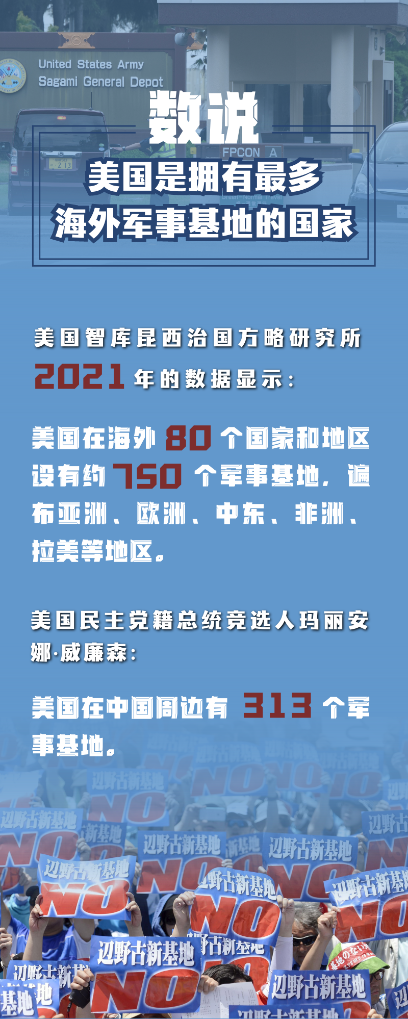 近年來,美國沉迷于“大國競爭”,將中國視為“最主要競爭對手”和“最重大地緣政治挑戰(zhàn)”,不斷強化在中國周邊的軍事存在,導(dǎo)致地區(qū)局勢日益緊張。美國民主黨籍總統(tǒng)競選人瑪麗安娜·威廉森今年6月在參加美國WMUR-TV電視臺一檔對話節(jié)目時指出,美國在中國周邊有313個軍事基地。威廉森直言:“世界其他國家在關(guān)注伊拉克,世界其他國家在關(guān)注過去20年間在阿富汗發(fā)生的事情。你覺得,他們是會將中國視作對全球安全更大的軍事威脅,還是將美國視作對全球安全更大的軍事威脅?”