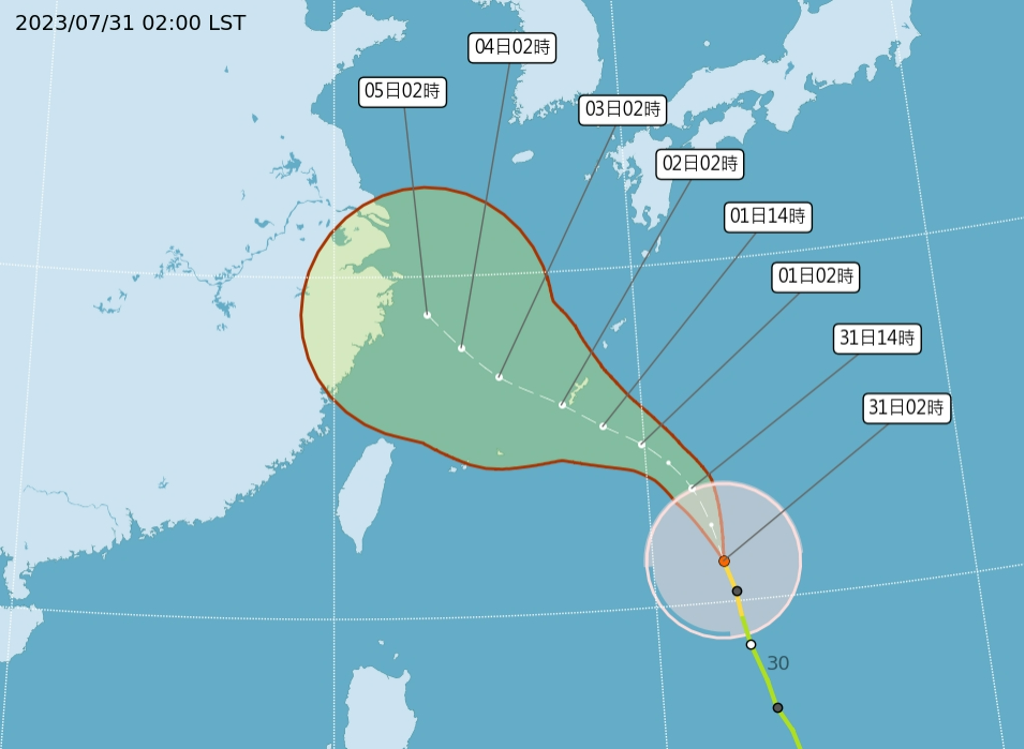 周四臺風(fēng)進(jìn)入東海的速度稍減緩,加上高壓減弱,路徑變量擴大。(翻攝自臺氣象部門)