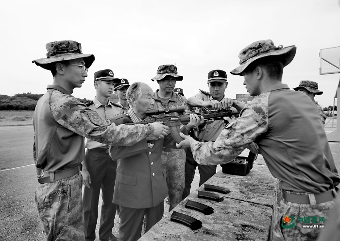 為紀(jì)念抗美援朝戰(zhàn)爭(zhēng)勝利70周年,第79集團(tuán)軍某旅近日邀請(qǐng)90歲志愿軍老兵胡長哲來到駐訓(xùn)地參觀,與青年官兵共同紀(jì)念這場(chǎng)偉大的勝利。