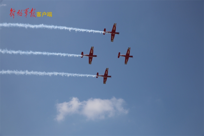 精彩的特技飛行,一次次點燃觀眾的熱情,引發(fā)一片片此起彼伏的歡呼聲。只見“紅鷹”飛行表演隊駕駛著8架飛機以紅鷹隊形通場,宛如一只雄鷹翱翔在藍(lán)天。接著,他們變換隊形,組成“鉆石隊”,在這一隊形中,飛機與飛機之間的距離只有3米左右,表演難度極高,但他們以完美的姿態(tài)為觀眾呈現(xiàn)了“紅鷹”飛行表演隊的招牌動作——八機鉆石斤斗。飛機在空中拉出的彩色煙帶耀眼奪目、氣勢如虹,彰顯著飛行員高超的本領(lǐng)和自信勇敢的心態(tài)。
