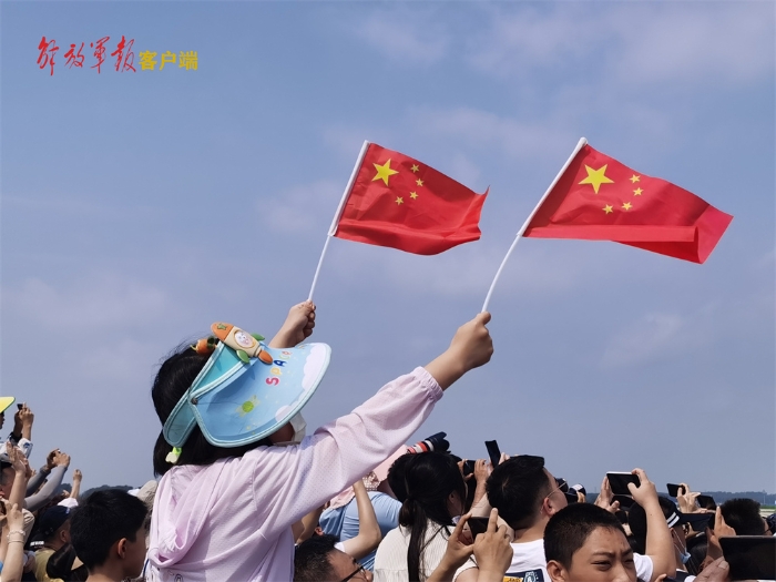 觀看飛行表演時,觀眾揮舞國旗,表達(dá)對祖國的熱愛。杜圣攝
