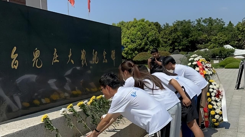 圖為弘法滄瀾實踐隊的隊員們依次走到紀念碑獻上鮮花,以史為鑒