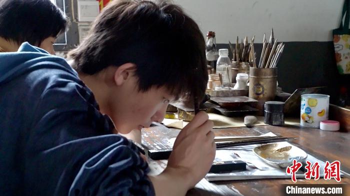 7月31日,來(lái)自美國(guó)的臺(tái)胞青年高以洋體驗(yàn)徽墨描金。中新社記者 張楊彬 攝