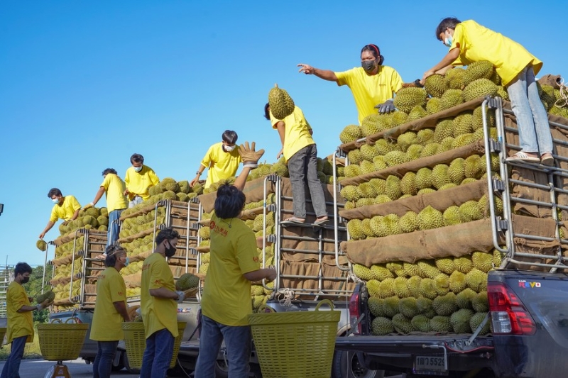 2021年5月30日,在重慶洪九果品股份有限公司位于泰國(guó)尖竹汶府的工廠內(nèi),工作人員在裝運(yùn)即將銷(xiāo)往中國(guó)的榴蓮。新華社發(fā)