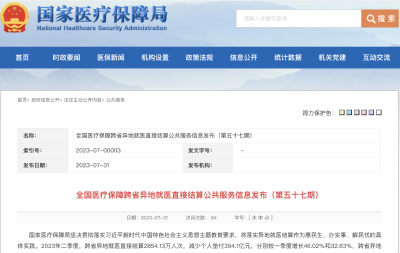 此外,住院費用跨省直接結(jié)算規(guī)模進一步增長。截至2023年二季度末,全國住院費用跨省聯(lián)網(wǎng)定點醫(yī)療機構(gòu)達7.44萬家,較一季度末增長0.69萬家。2023年二季度,住院費用跨省直接結(jié)算282.57萬人次。