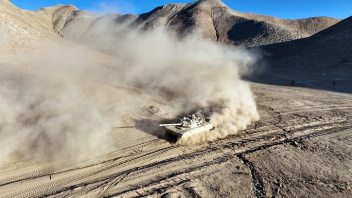 在海拔4000米的野外訓(xùn)練場(chǎng),西藏軍區(qū)某旅坦克分隊(duì)展開復(fù)雜山地路段駕駛機(jī)動(dòng)考核(2023年1月3日攝)。新華社發(fā)(曹智 攝)