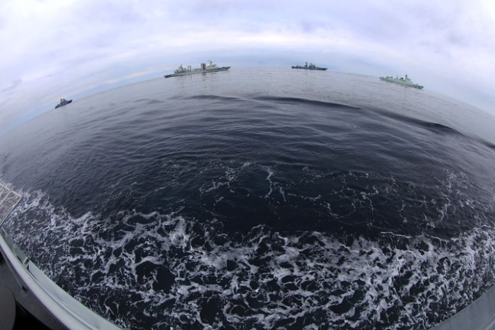 在日本海某海域進(jìn)行的“北部·聯(lián)合-2023”演習(xí)中,中俄雙方艦艇編隊(duì)航行(2023年7月20日攝)。新華社發(fā)(張海龍 攝)