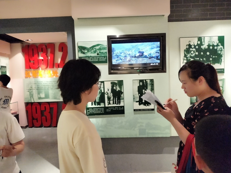 7月17日當(dāng)天,團(tuán)隊(duì)成員們從紀(jì)念館大門進(jìn)入,首先映入眼簾的是寫著“西安八辦”的小汽車。之后,成員們在語音講解下了解了辦事處的創(chuàng)立背景和發(fā)展歷史,并在參觀途中尋找數(shù)字化建設(shè)設(shè)施:當(dāng)講解員講到辦事處的主要任務(wù)--抗日救亡運(yùn)動(dòng)的組織與指導(dǎo)、武裝斗爭的與協(xié)調(diào)、政治宣傳和群眾動(dòng)員、軍需物資的保障和分配時(shí),電子屏上播放起了演繹視頻;講到偉大的女性海倫·福斯特·斯諾時(shí),電子屏幕上播放了她的生平介紹;講到七賢莊的歷史沿革時(shí),展覽文物旁的電子屏上展出了標(biāo)志性事件的拼圖。該館內(nèi)數(shù)字化設(shè)施較多,展出形式較為多樣的。