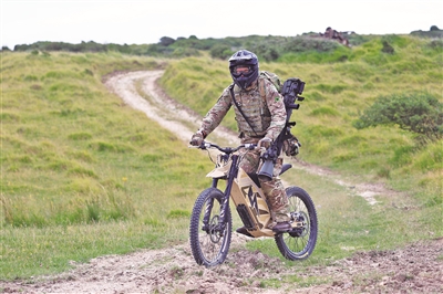 照片中這名全副武裝的士兵,身背“卡爾古斯塔夫M4”無后坐力炮,騎著一輛H-52“隱形者”電動自行車,馳騁在英格蘭西南部的拉爾沃思山區(qū),體驗前所未有的騎行速度。