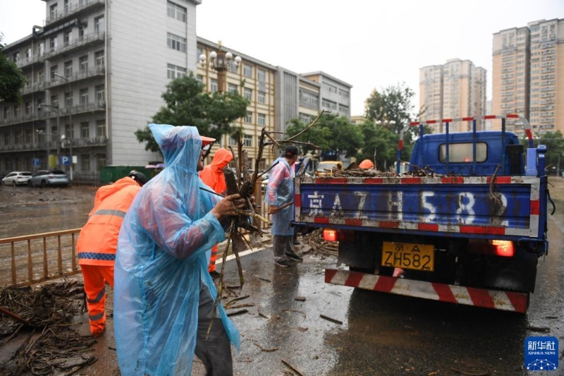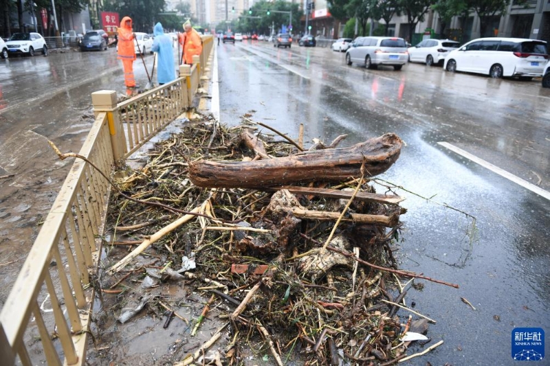 7月31日,環(huán)衛(wèi)工人在北京市門頭溝區(qū)新橋大街清理街道上的雜物。