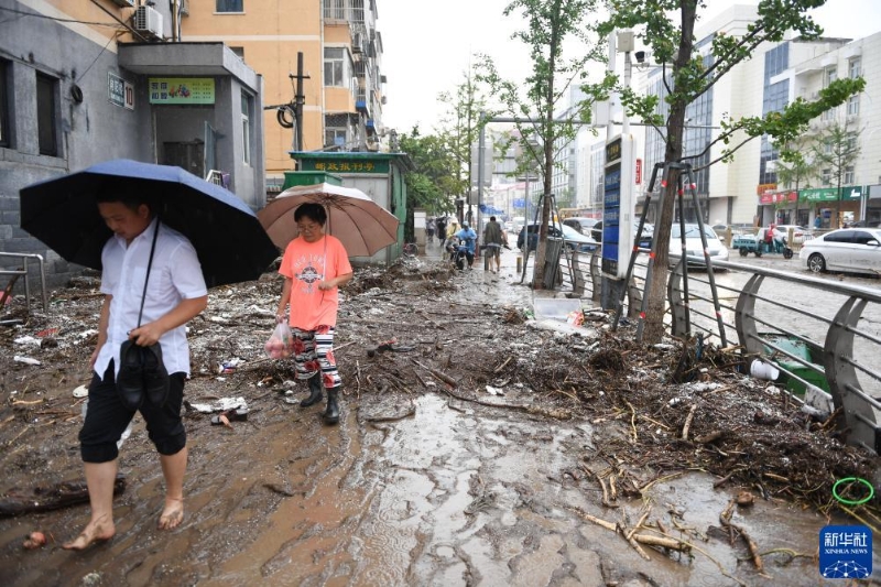 7月31日,在北京市門頭溝區(qū)雙峪路,行人從淤泥和雜物上走過。
