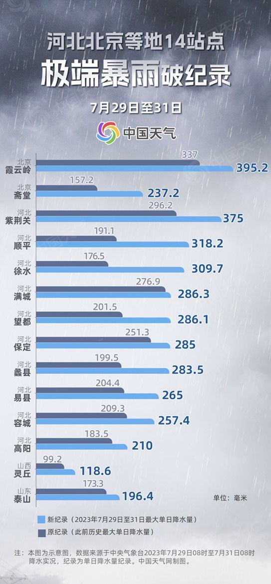 據(jù)中國(guó)天氣網(wǎng)氣象分析師石妍介紹,截至今天8時(shí),這輪降水過程華北、黃淮共計(jì)14個(gè)國(guó)家氣象觀測(cè)站日降水量突破歷史極值,分別是北京霞云嶺、齋堂,河北保定、望都、徐水、滿城、易縣、紫荊關(guān)、蠡縣、順平、容城、高陽,山西靈丘和山東泰山。