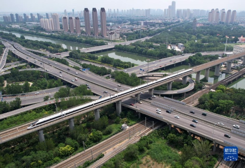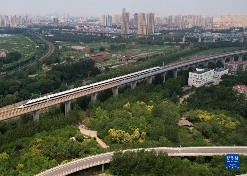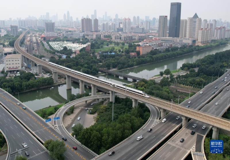 京津城際列車從天津城區(qū)穿行(7月20日攝,無(wú)人機(jī)照片)。