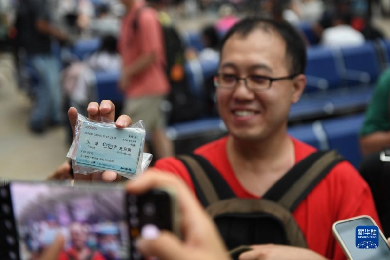 8月1日,一名旅客向記者展示2008年8月1日京津城際鐵路開(kāi)通運(yùn)營(yíng)時(shí)所購(gòu)買的火車票。