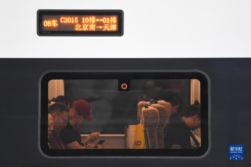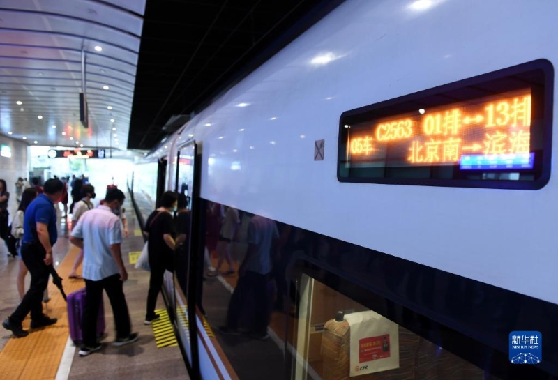 8月1日,在北京南站,旅客乘坐京津城際列車出行。