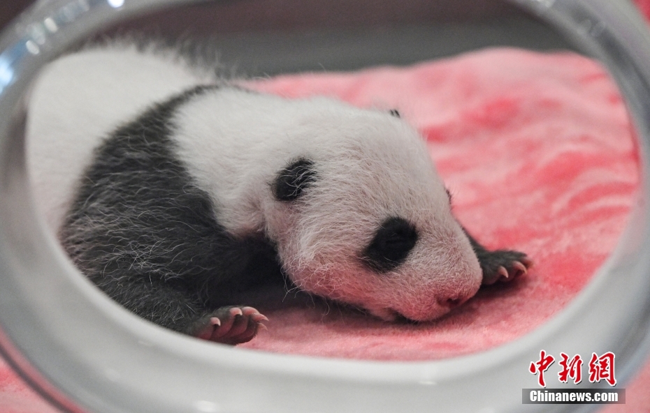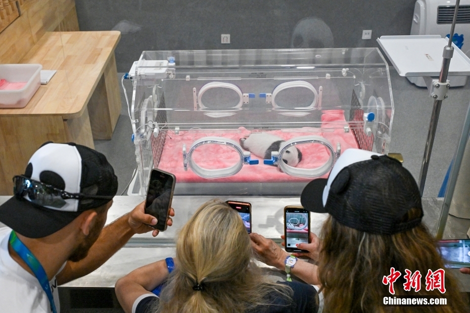 8月1日,參加第31屆世界大學生夏季運動會的大學生運動員們參觀成都大熊貓繁育研究基地。成都大運會期間,成都大熊貓繁育研究基地成為參賽代表團的熱門打卡點。圖為嬌小可愛的大熊貓幼仔。中新社記者 趙文宇 攝