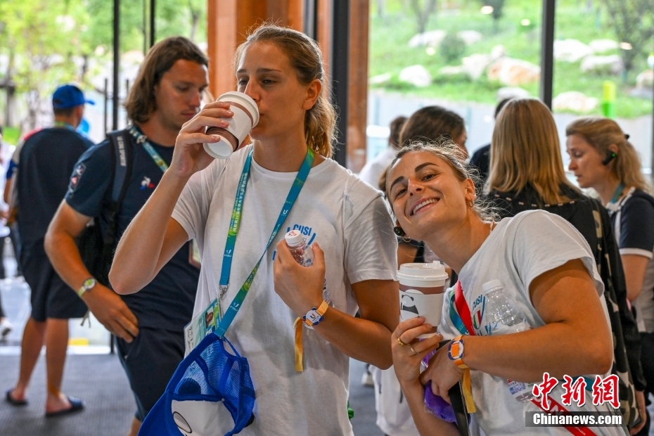 8月1日,參加第31屆世界大學生夏季運動會的大學生運動員們參觀成都大熊貓繁育研究基地。成都大運會期間,成都大熊貓繁育研究基地成為參賽代表團的熱門打卡點。圖為來自意大利的運動員品嘗“熊貓”咖啡。中新社記者 趙文宇 攝